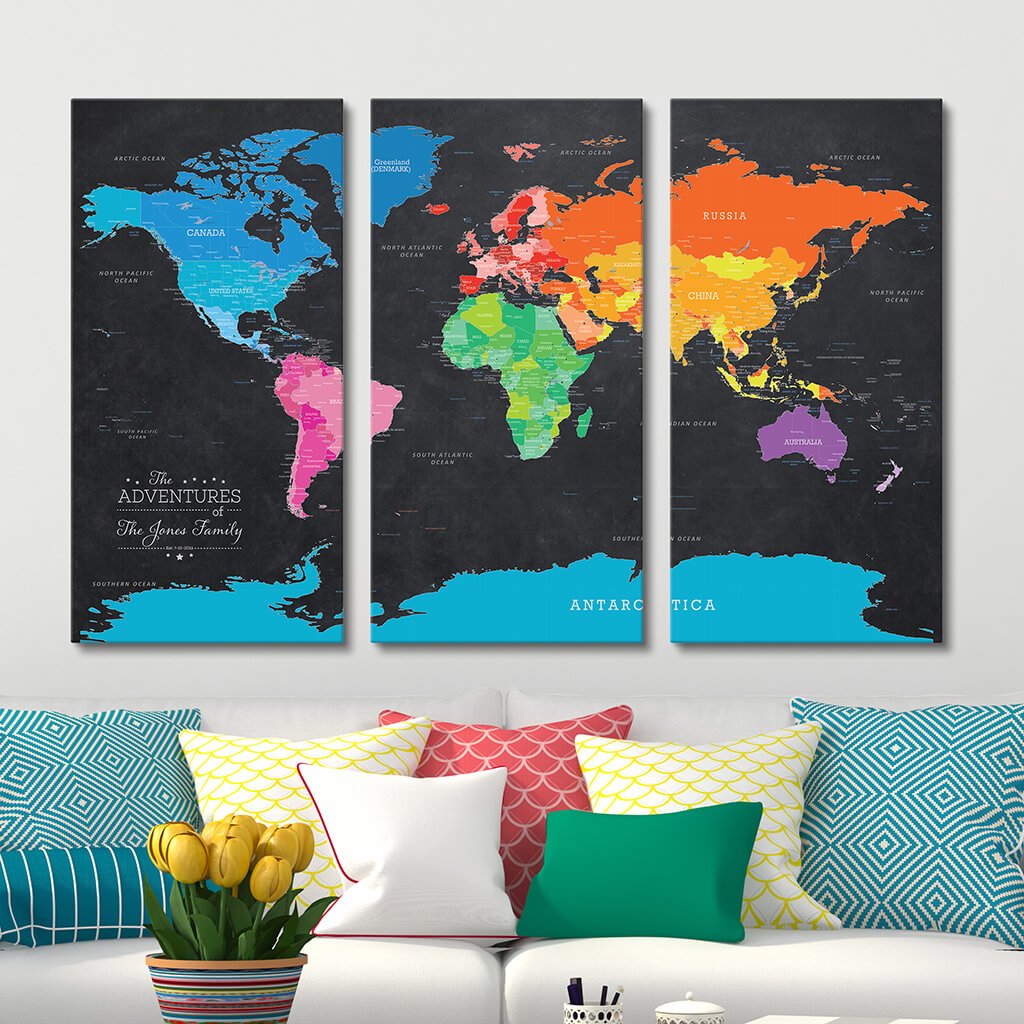 3 Panel Canvas Wall Map | Bright World Map | Push Pin Travel Maps