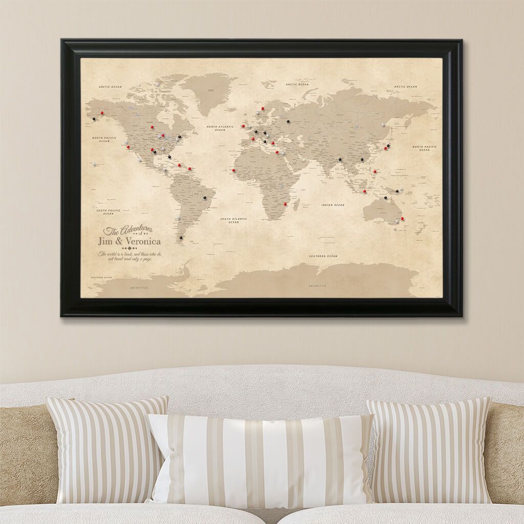 Old Style Map | Vintage World Travel Map with Frame Push Pin