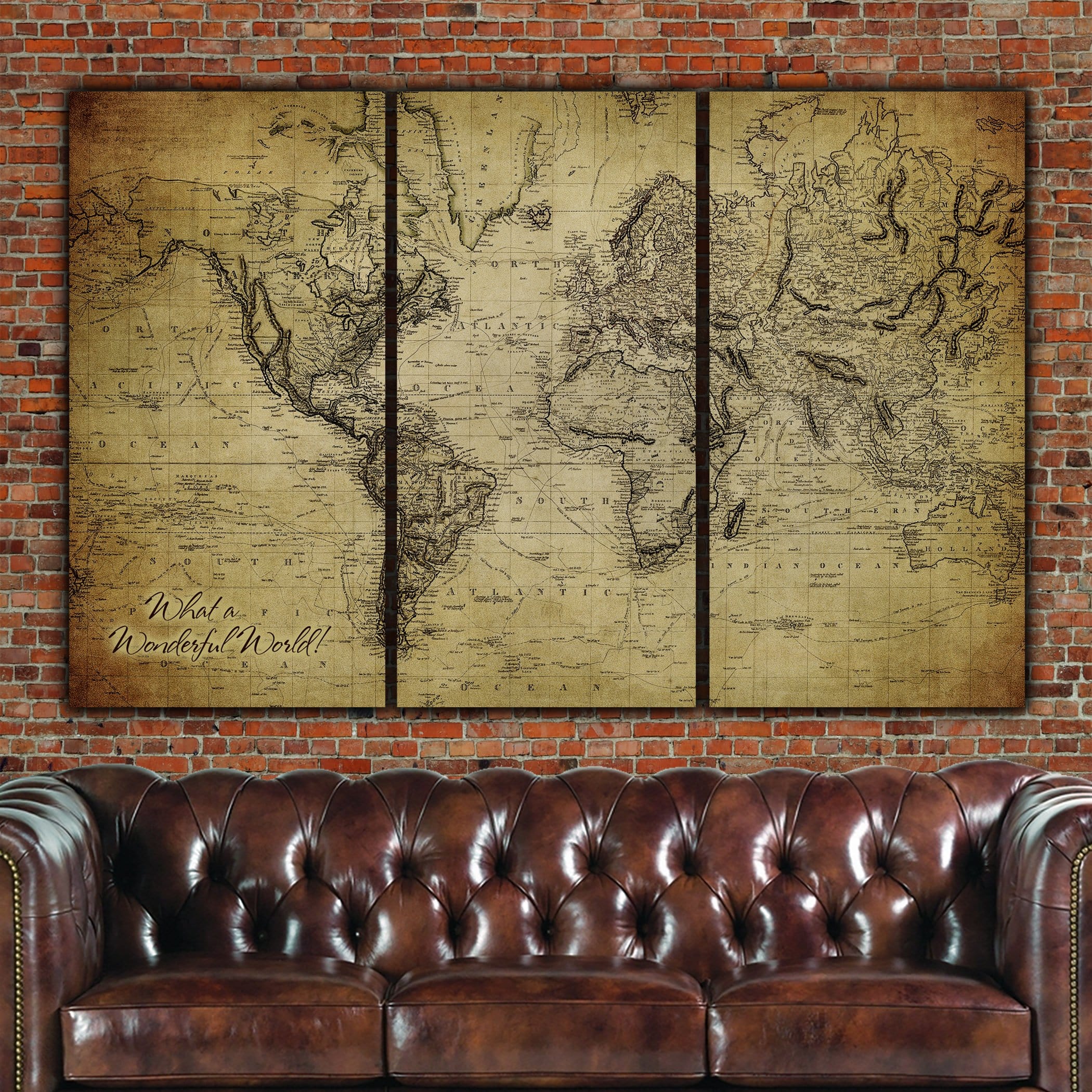 Golden Brown Vintage World Map Wall Art 3 Panel | Holy Cow Canvas